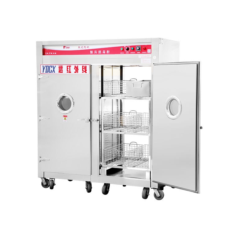 ■ 通道式远红外线热风循环餐具消毒柜采用远红外线金属电热管加热、热风循环,加热速度快、温度均匀、省电。